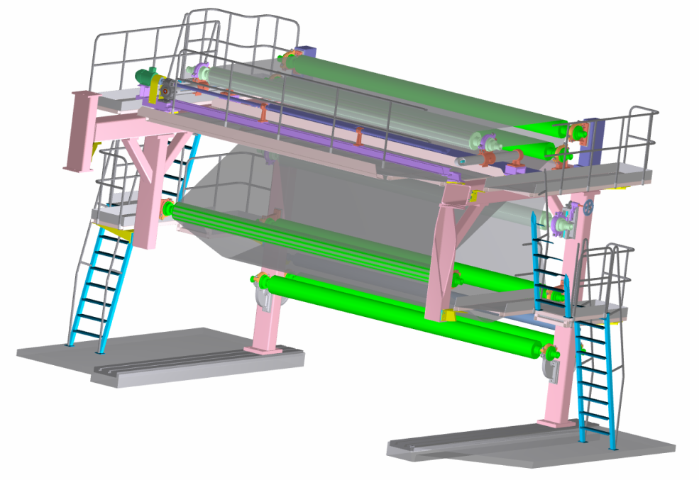 Металлоконструкция предназначена для установки верхнего сукна на 3-м прессе пресспата. (машина для производства целлюлозы) Установка верхнего сукна увеличивает сухость массы после выхода из под пресса.
