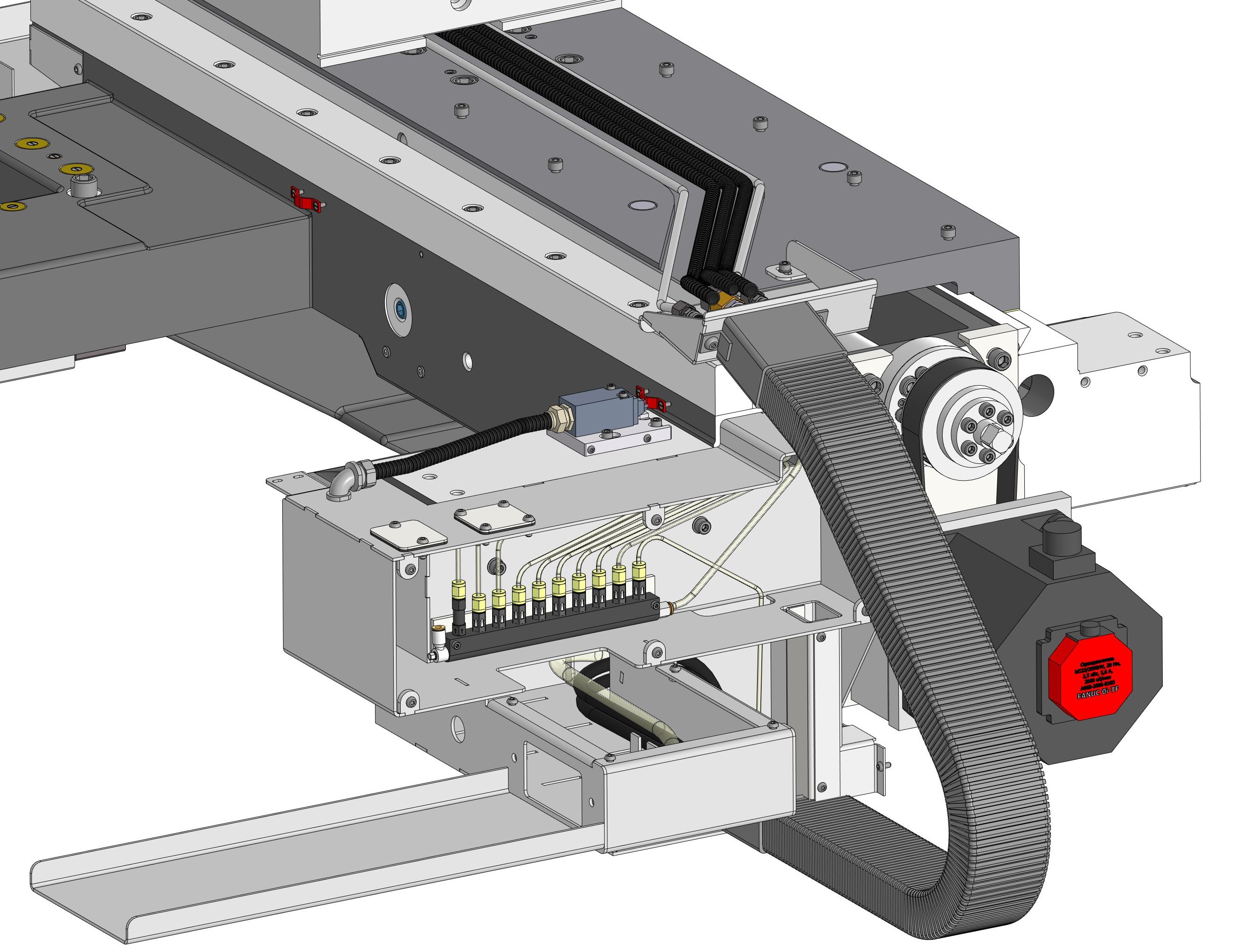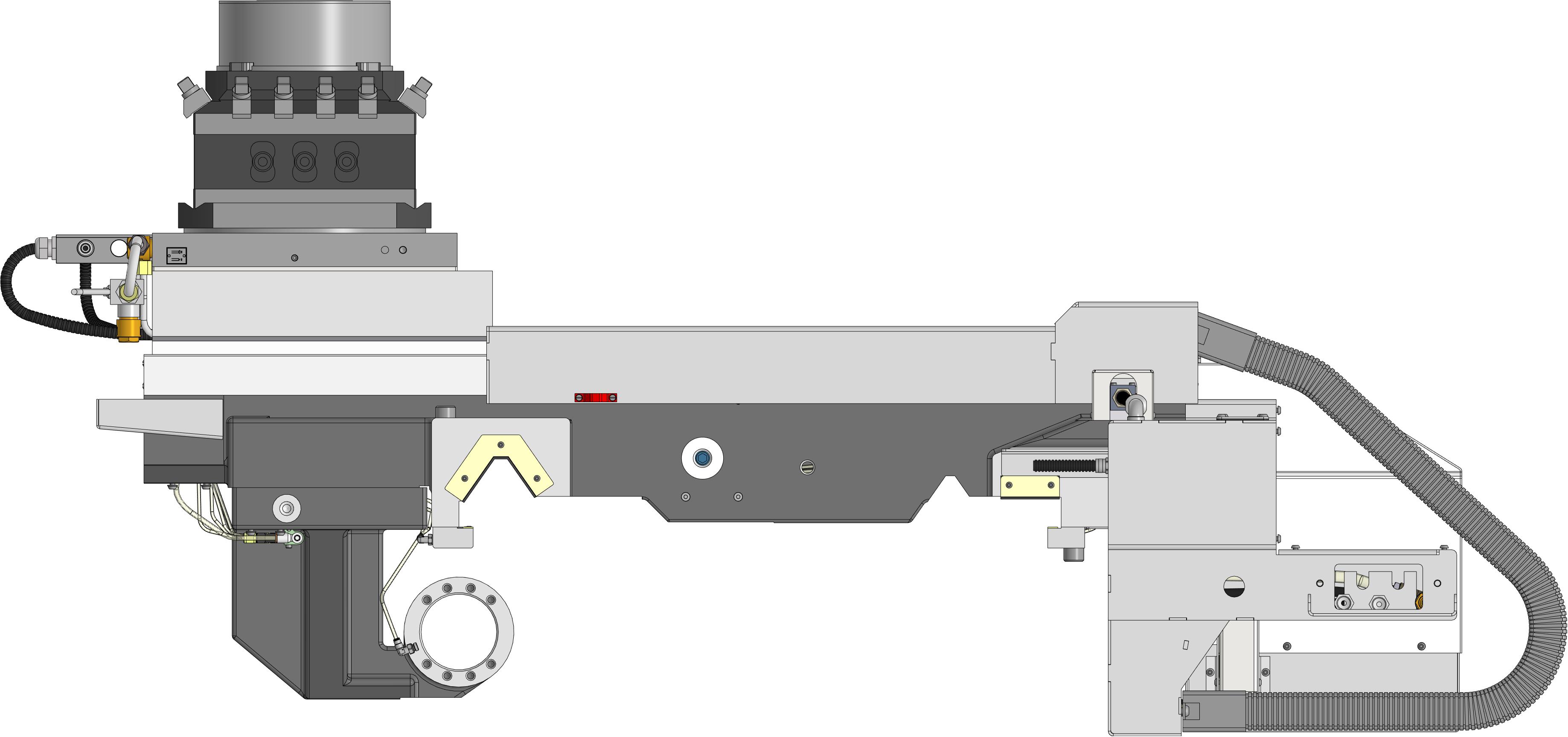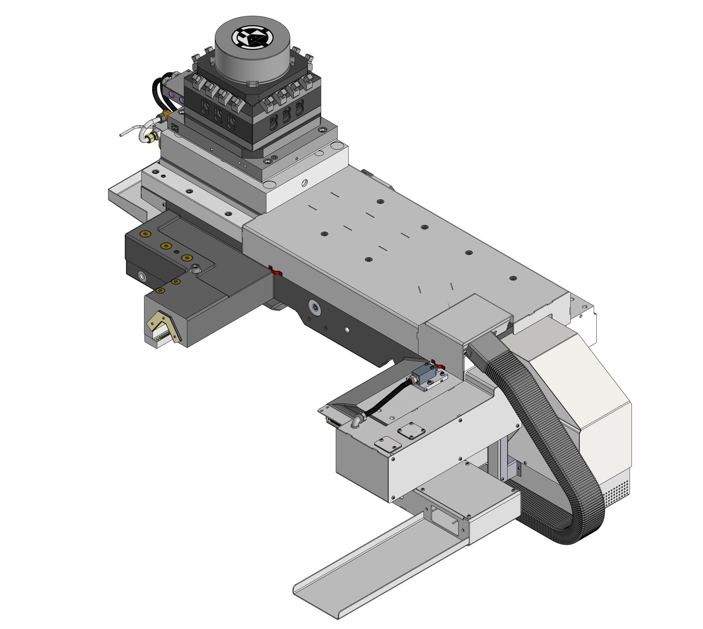 Суппорт трубонарезного станка предназначен для перемещения закрепленного в револьверной головке инструмента вдоль оси шпинделя, поперек оси шпинделя и под углом к оси шпинделя. Управление перемещением суппорта, а также выбором инструмента осуществляется системой ЧПУ.