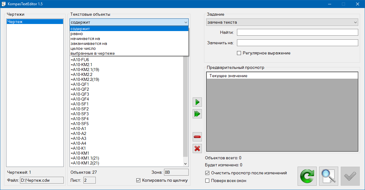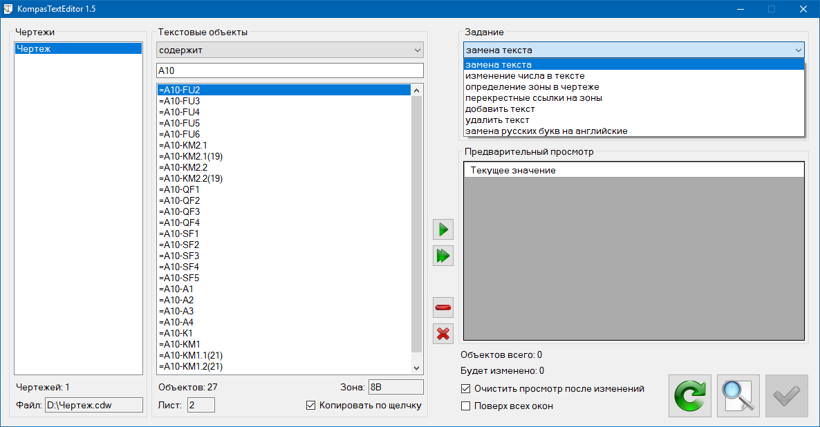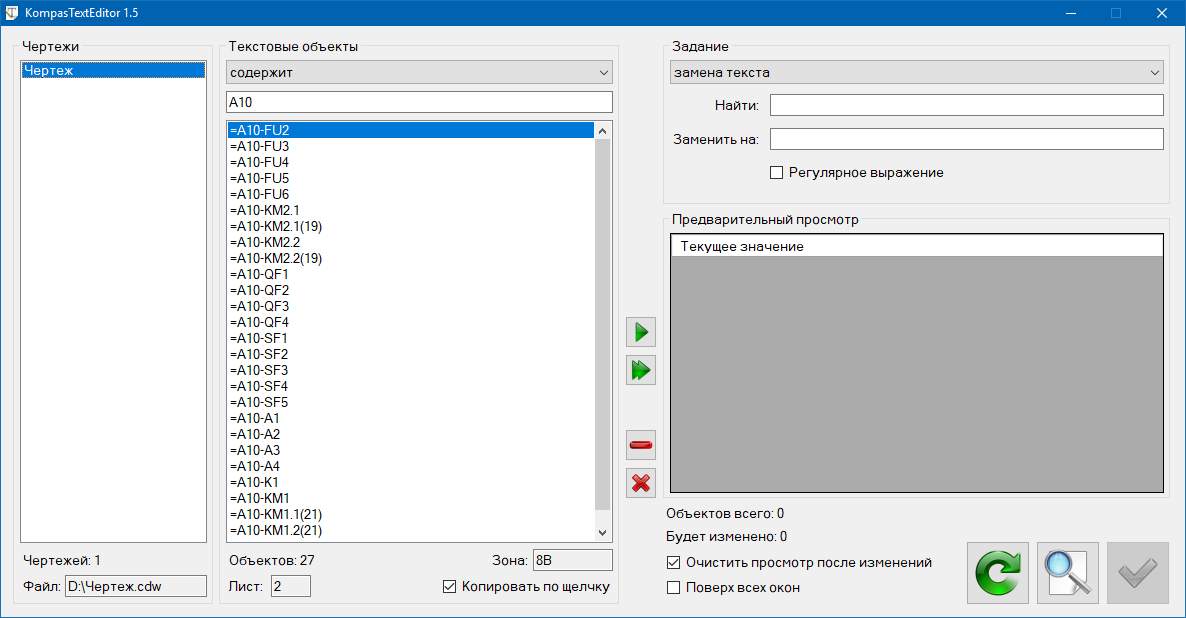 Программа KompasTextEditor предназначена для пакетного редактирования текстовых объектов в чертежах КОМПАС-3D.