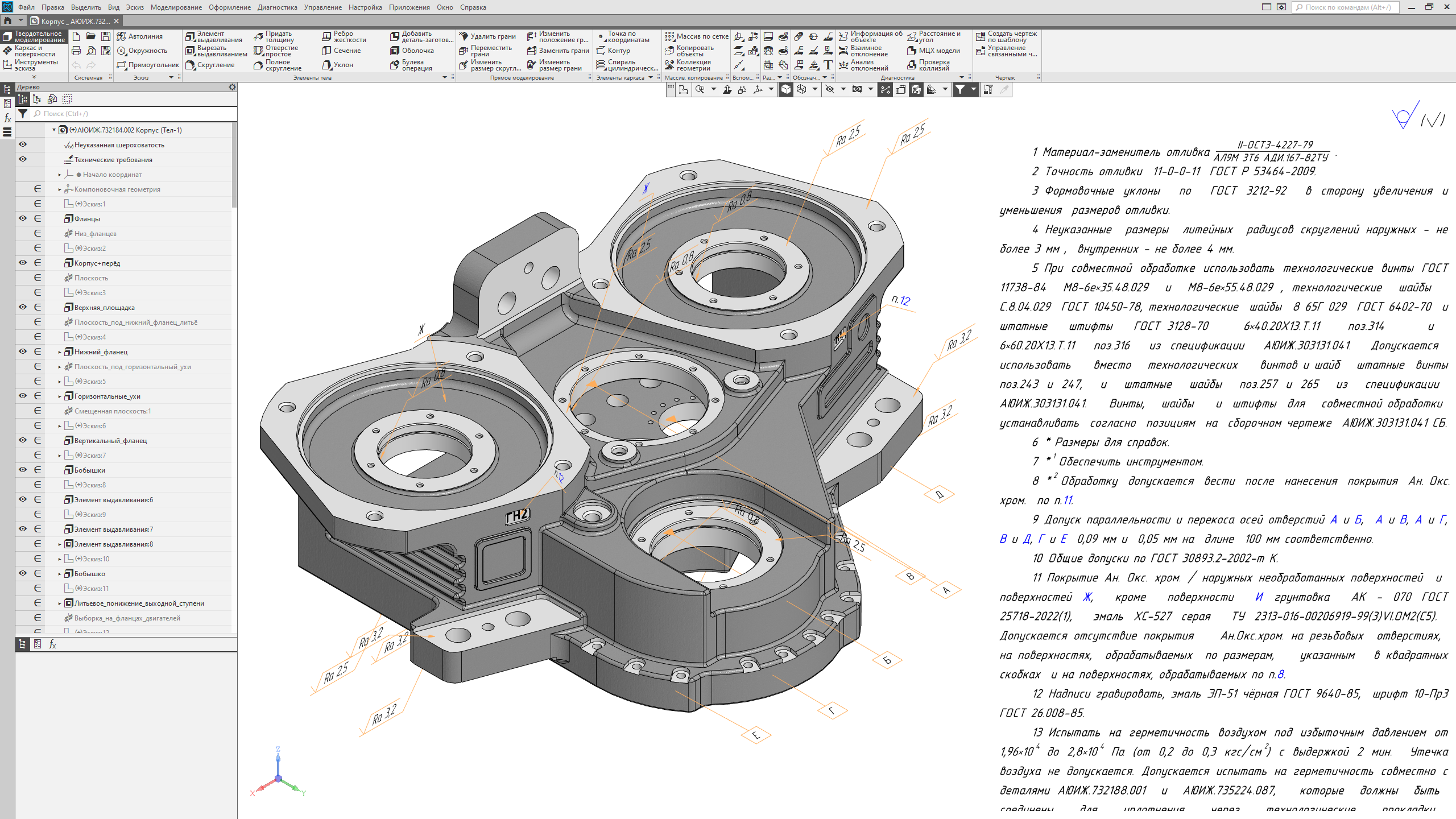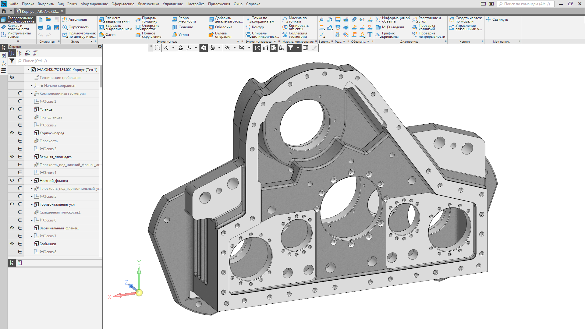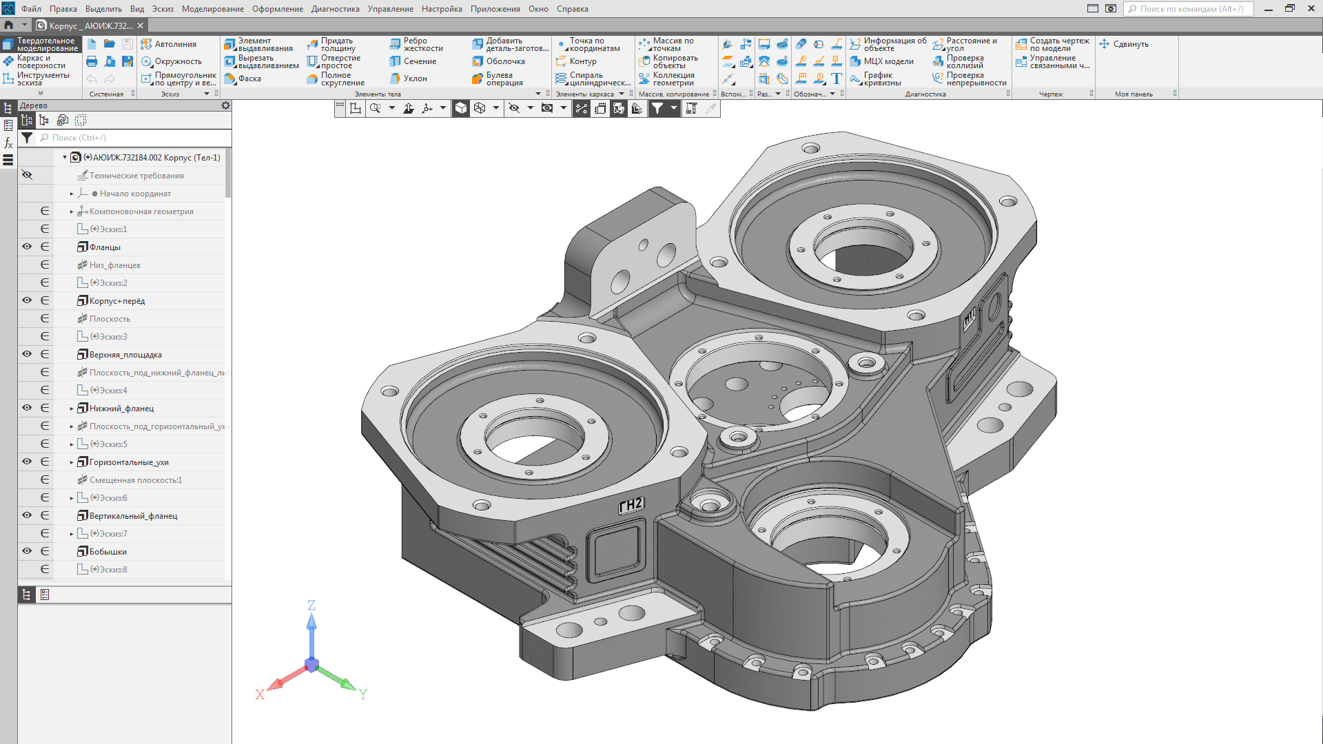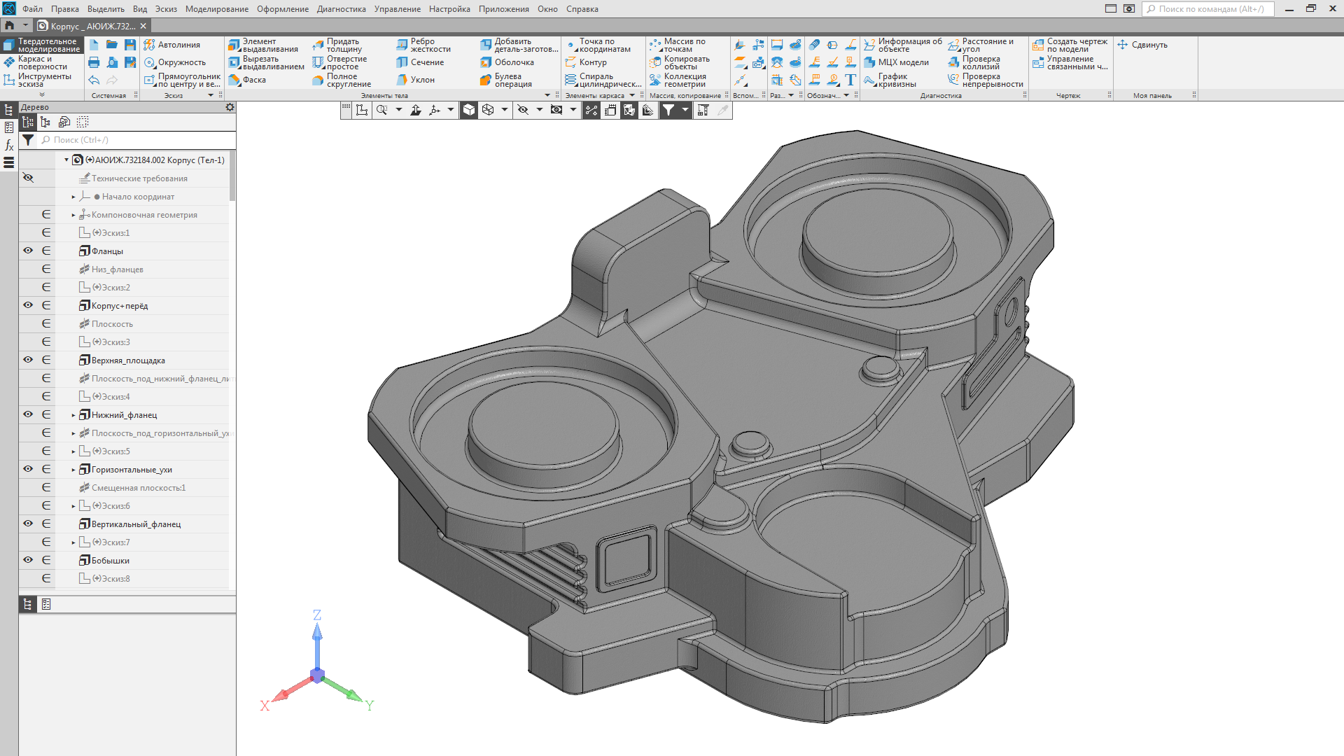 Корпус предназначен для установки механических подвижных и неподвижных частей дифференциального электромеханического привода. Предоставляет собой монолитную конструкцию, изготавливаемую методом литья с последующей механической обработкой.